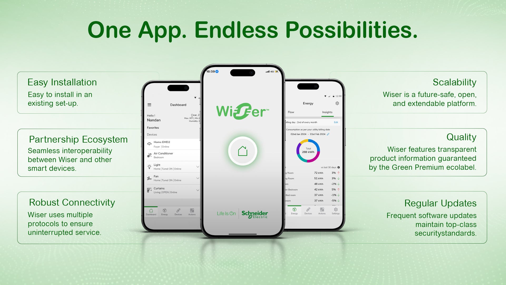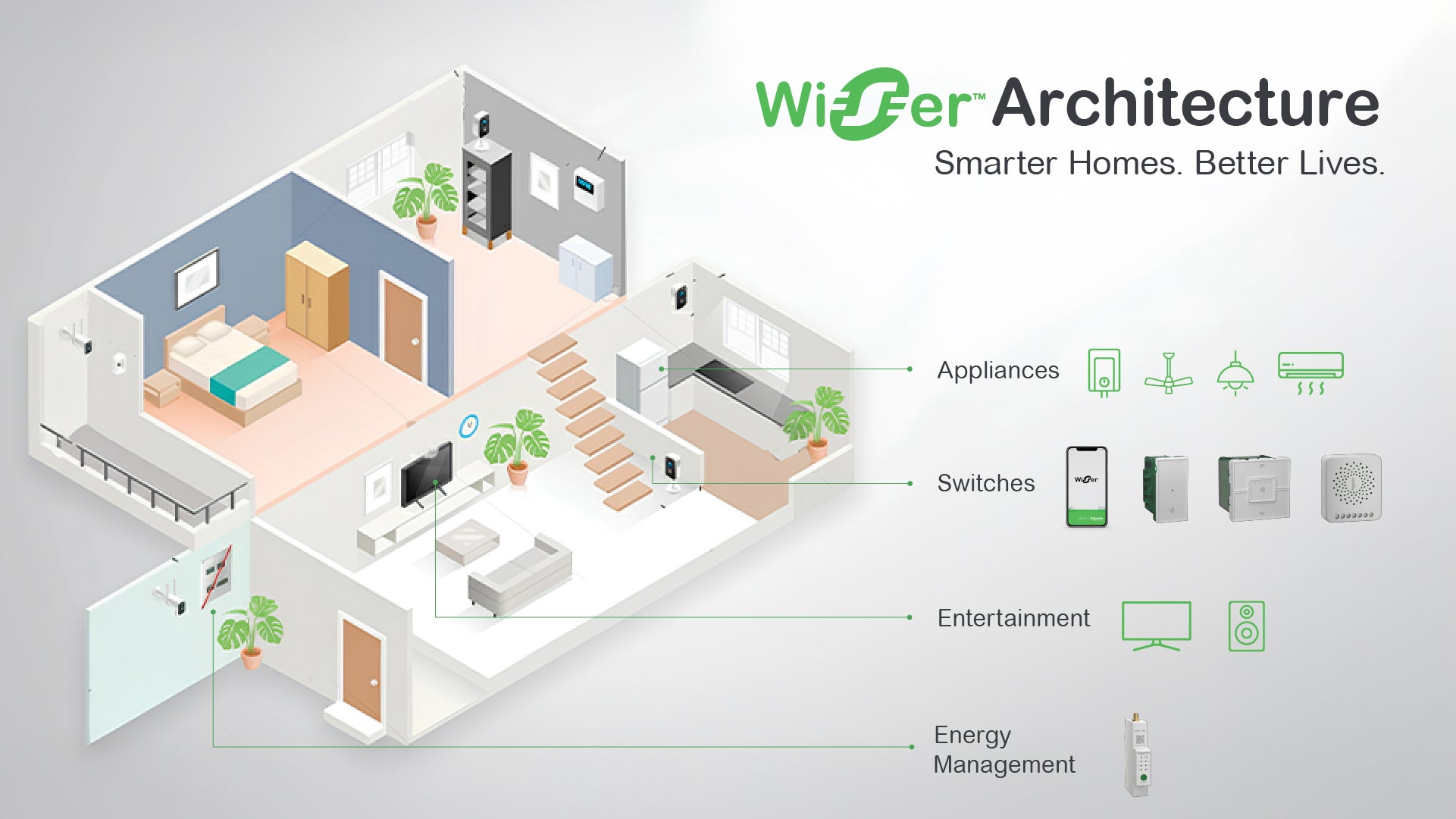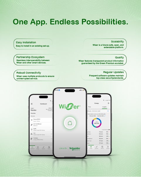Control your lights, AC, and geysers easily with the Wiser Carbon Grey smart switch using the button or the Wiser app from anywhere with just a tap.